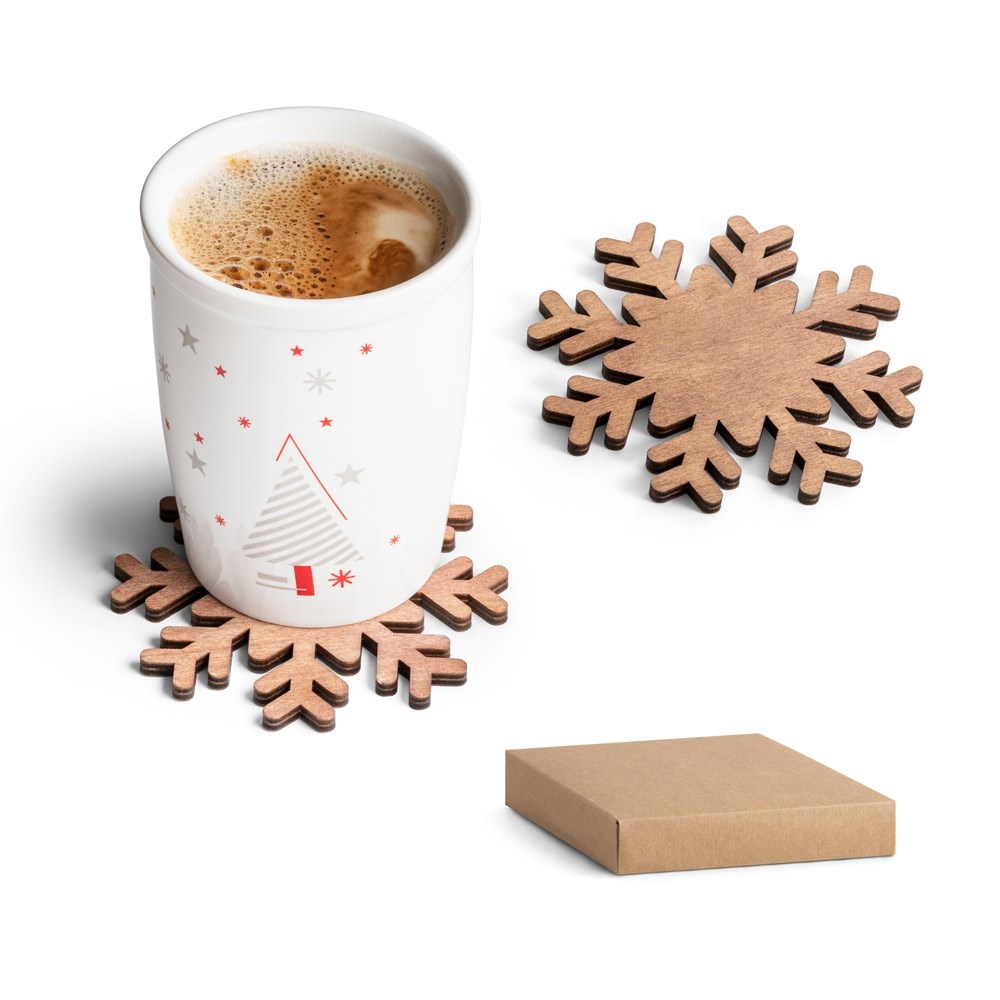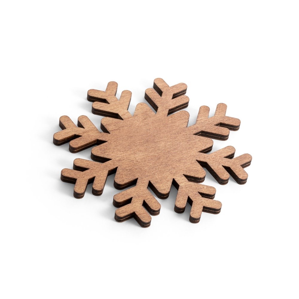4 Glasuntersetzer aus Sperrholz in Schneeflockenformat. Geliefert in einer Kraftpapierschachtel. 100 x 100 x 5 mm | Schachtel: 105 x 105 x 20 mm