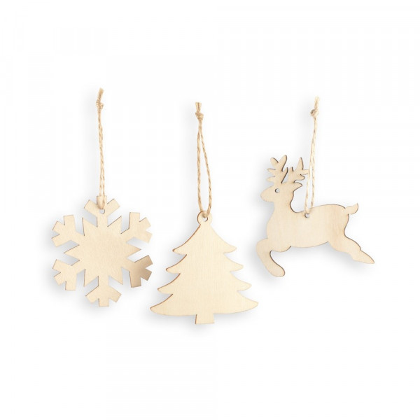 3 unterschiedliche Weihnachtsfiguren aus Sperrholz zum Aufhängen. Rentier: 85 x 80 x 2 mm | Schneeflocke: ø78 x 2 mm | Weihnachtsbaum: 80 x 79 x 2 mm