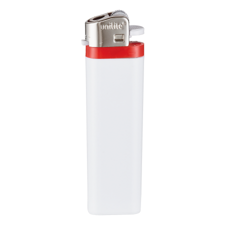 Weißes Einwegfeuerzeug mit farbigem Rand.