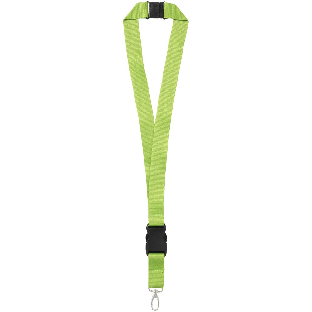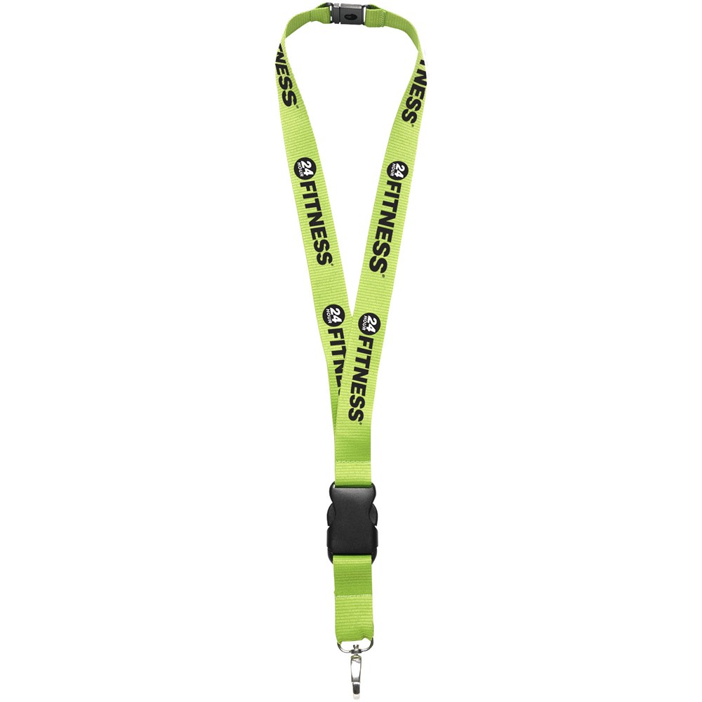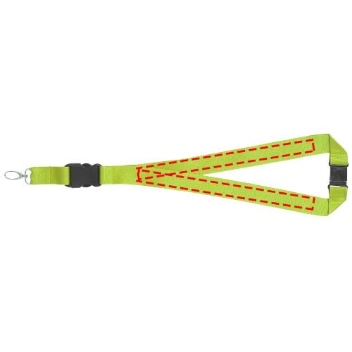 Schlüsselband für Namensschilder, Ausweise oder Schlüssel. Einfach abnehmbare Schnalle und Sollbruch-Verschluss beseitigt Strangulierungsgefahren. Setup-Kosten für die zweite Position entfällt, wenn auf beiden Seiten eine Werbeanbringung mit dem selben Bildmaterial erfolgt. Druckkosten pro Position fallen dennoch an.