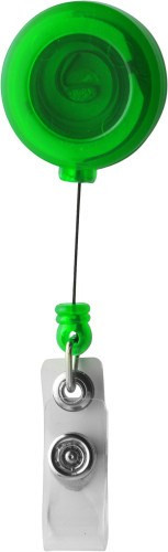 Ausweishalter aus Kunststoff, mit Befestigungsclip aus Metall/Kunststoff und Nylon-Ausziehleine (bis ca. 80 cm).
