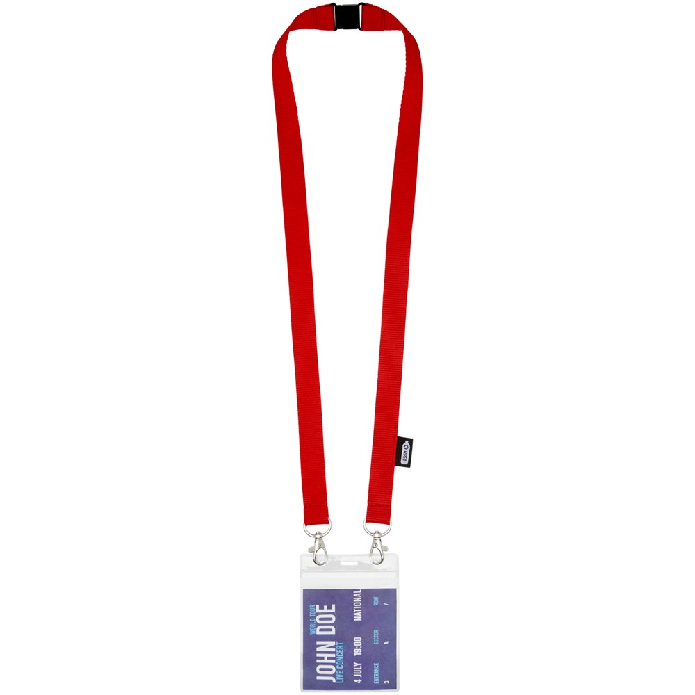 Schlüsselband aus recyceltem PET Kunststoff mit Abreißverschluss zur Befestigen einer Gesichtsmaske und eines Ausweishalters. Wird mit zwei hochwertigen ovalen Haken mit Karabinerhaken geliefert. Besonders geeignet für breite Kartenhalter. Eine nachhaltiges Produkt mit einem hervorragenden Preis-Leistungs-Verhältnis und großer Logofläche.