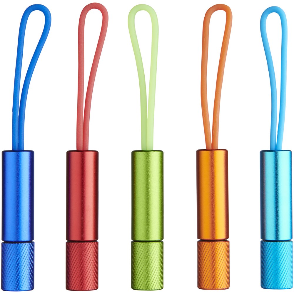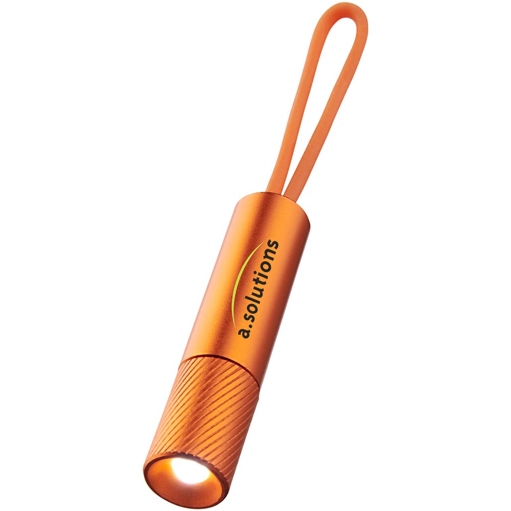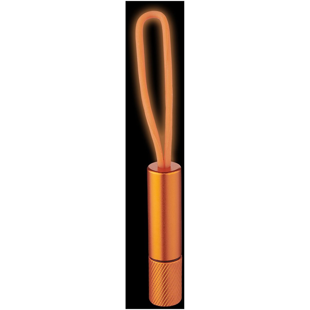 Schlüssellicht mit einer weißen LED und einem farblich abgestimmten, im Dunkeln leuchtenden, Silikonband und einem Ein-/Aus-Drehschalter. Mit Batterien.