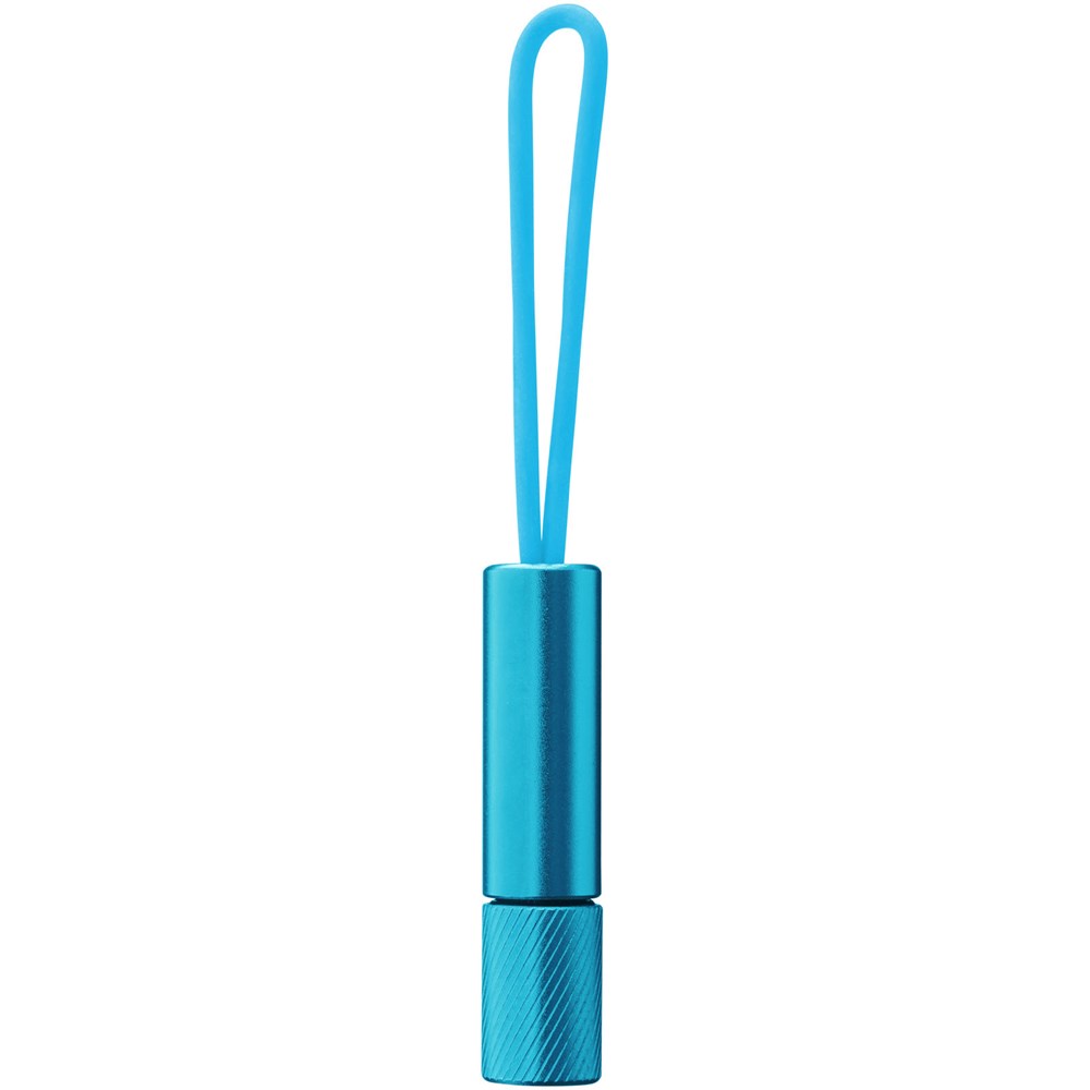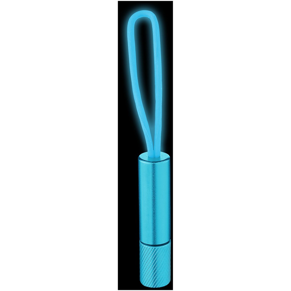 Schlüssellicht mit einer weißen LED und einem farblich abgestimmten, im Dunkeln leuchtenden, Silikonband und einem Ein-/Aus-Drehschalter. Mit Batterien.