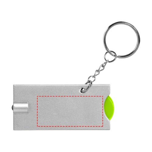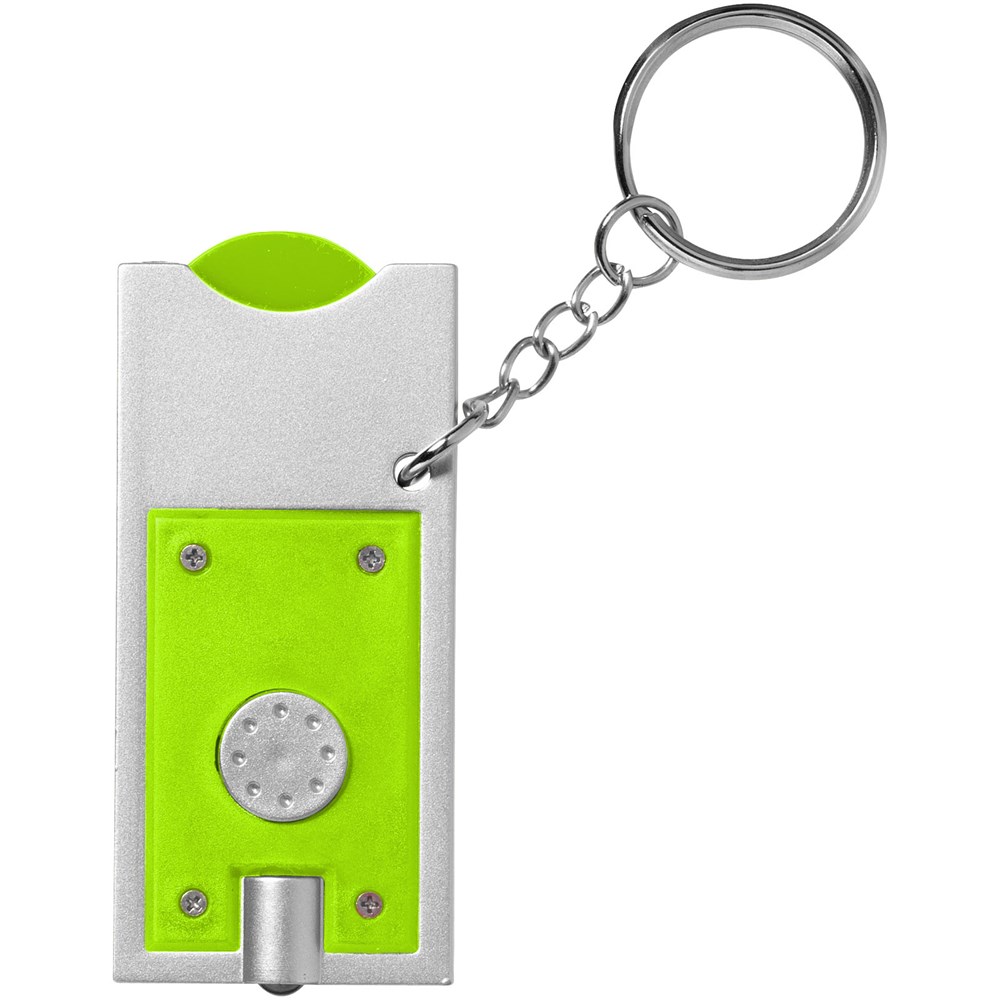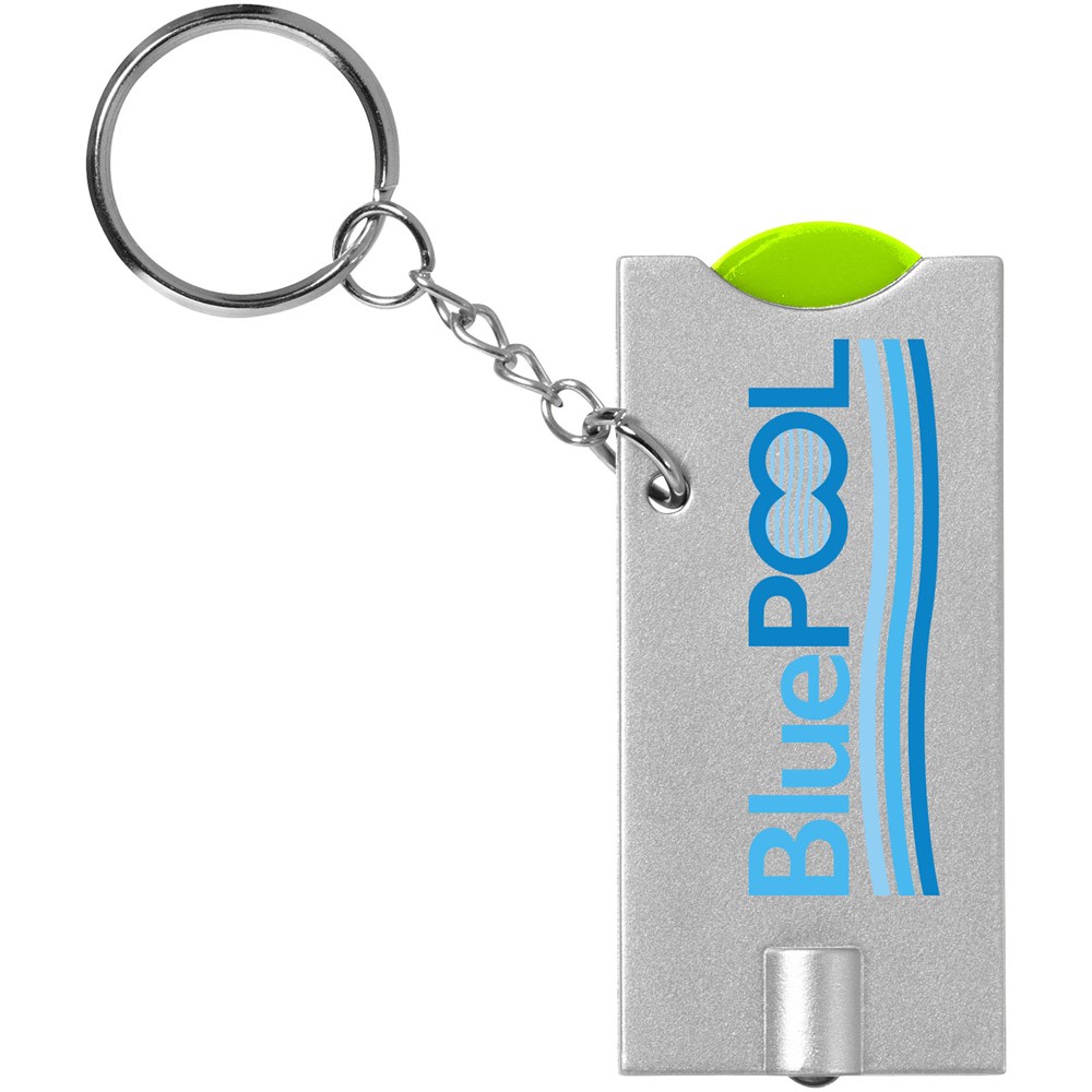 1 Euro große Plastikmünze mit 6 mm Loch und Halter und einem weißen LED Schlüssellicht. Geteilter Schlüsselring aus Metall mit einem Durchmesser von 25 mm. Batterien mitgeliefert und eingelegt.