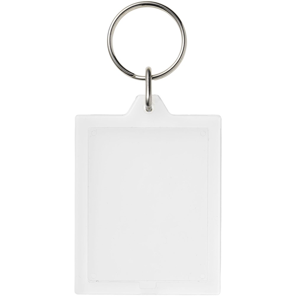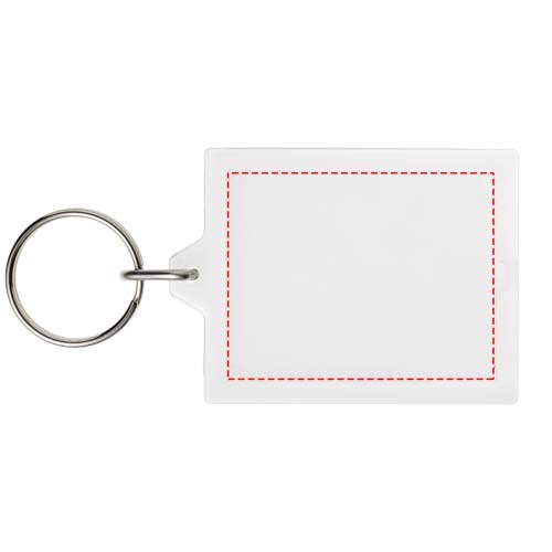 Transparenter, rechteckiger E1-Schlüsselanhänger mit metallenem Schlüsselring. Der Metallring bietet ein flaches Profil, das sich ideal für Mailings eignet. Abmessungen der Druckeinlage: 4,5 cm x 3,5 cm.