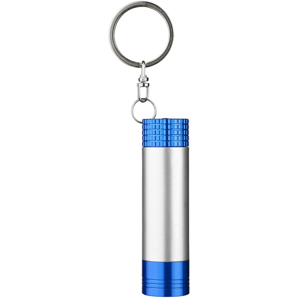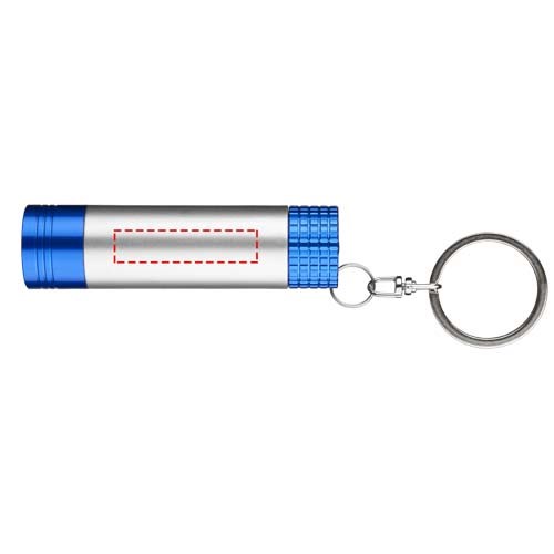 Einzelne weiße LED-Leuchte mit Druckknopfschalter auf der Rückseite. Ideal zum Gravieren, da Ihr Logo beim Herausziehen der Fassung zu sehen ist. Schlüsselring aus Metall. Batterien enthalten.