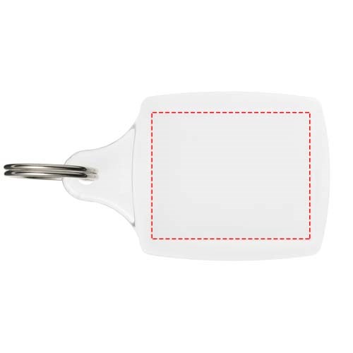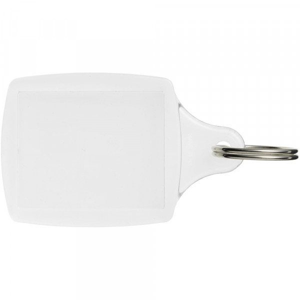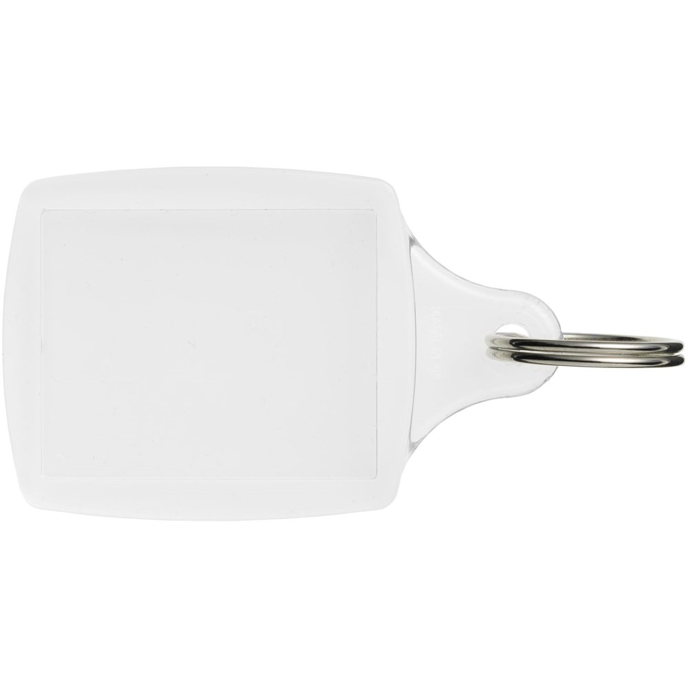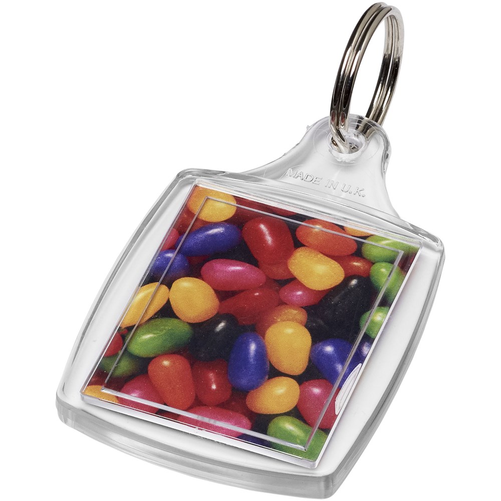 Transparenter S5-Schlüsselanhänger mit metallenem Schlüsselring. Abmessungen der Druckeinlage: 4,0 cm x 3,2 cm.