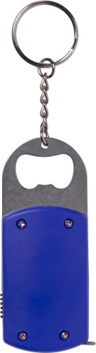 Schlüsselanhänger aus Kunststoff, mit LED-Lampe (weiß), Flaschenöffner aus Metall, Maßband (Länge ca. 1 m) und Metall-Schlüsselkette.