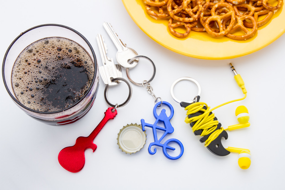 Aluminium-Schlüsselanhänger in Fahrrad-Form mit Flaschenöffner-Funktion.