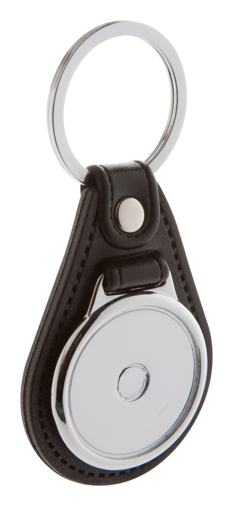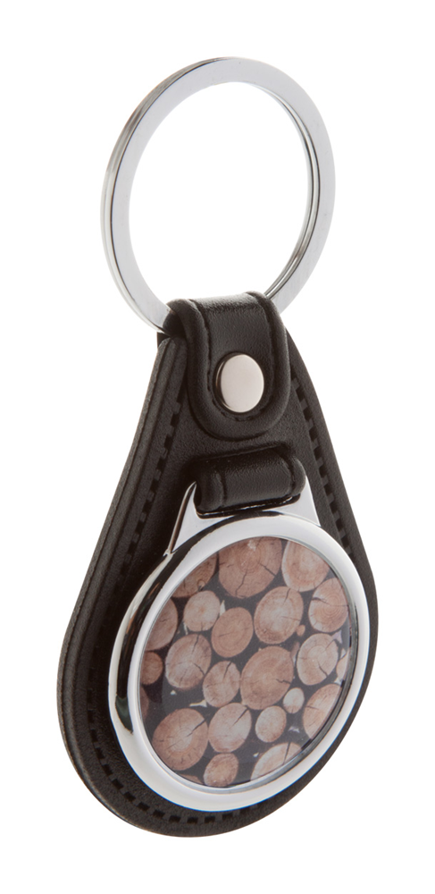 Runder Schlüsselanhänger aus Kunstleder mit Doming-Druck auf dem Metallplättchen. Preis inkl. Doming. Mindestmenge: 100 Stk.