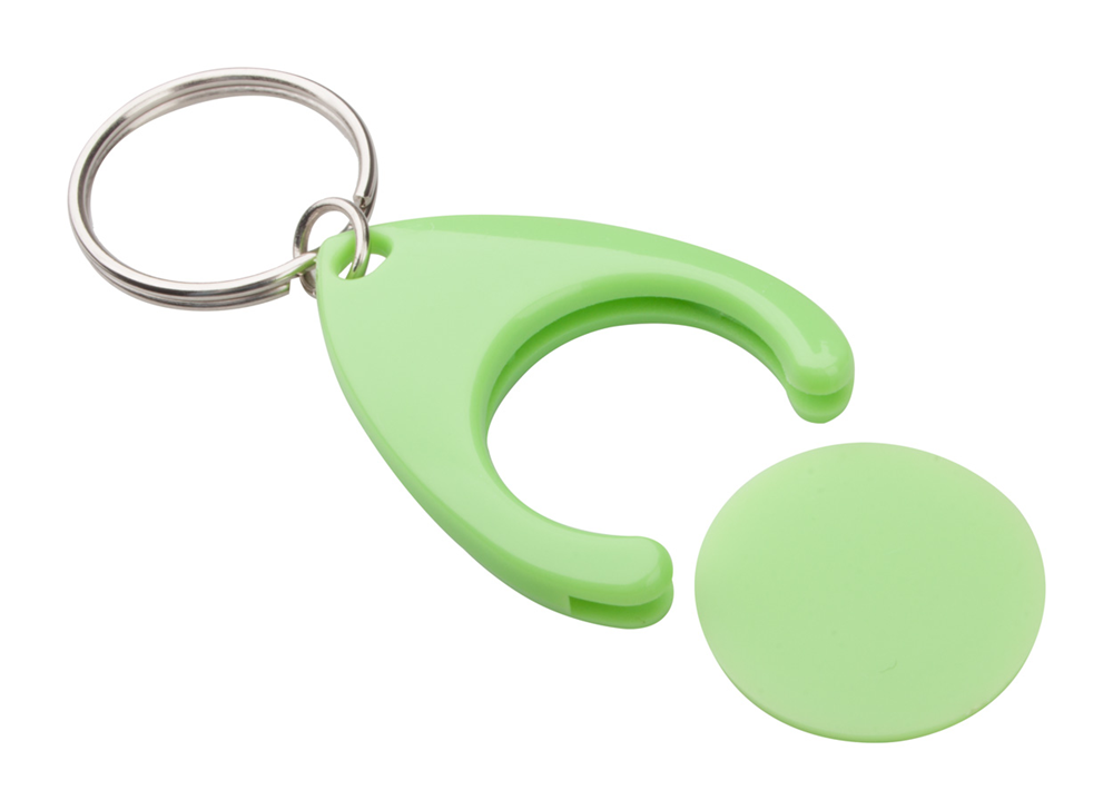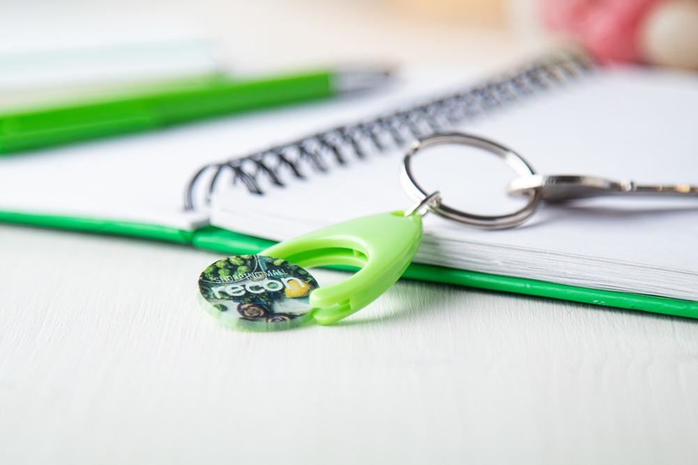 Schlüsselanhänger mit Einkaufswagen-Chip aus Kunststoff mit Metall-Schlüsselring. Chipgröße: ø24×2 mm.