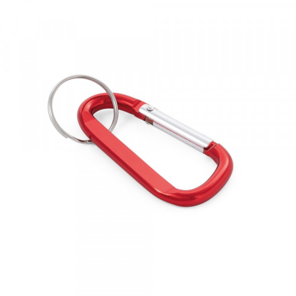 Karabinerclip aus Aluminium mit Schlüsselring und flachem Veredelungsbereich. Nicht zum Klettern geeignet. 32 x 57 x 5 mm