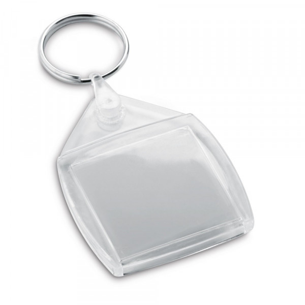 Schlüsselanhänger aus PS, transparent, viereckig und mit Schlüsselring. 43 x 55 x 5 mm