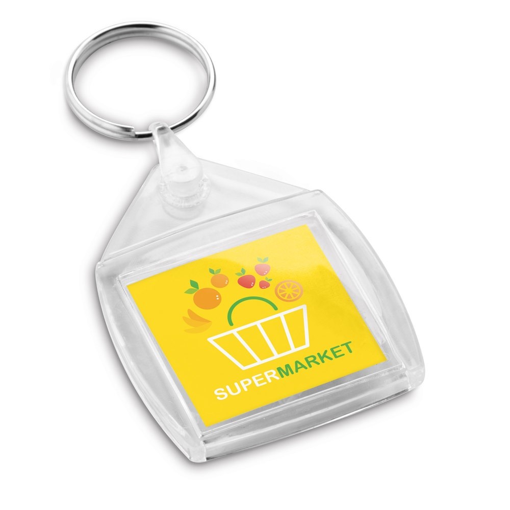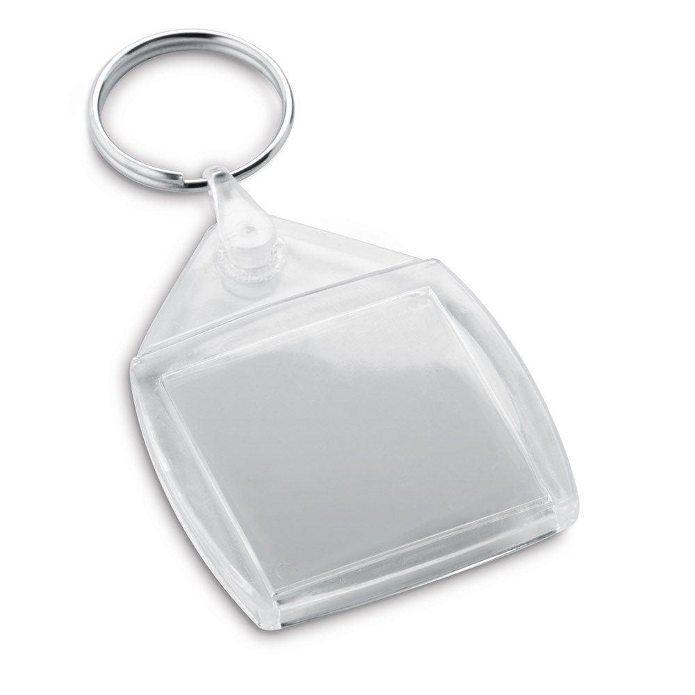 Schlüsselanhänger aus PS, transparent, viereckig und mit Schlüsselring. 43 x 55 x 5 mm mehr