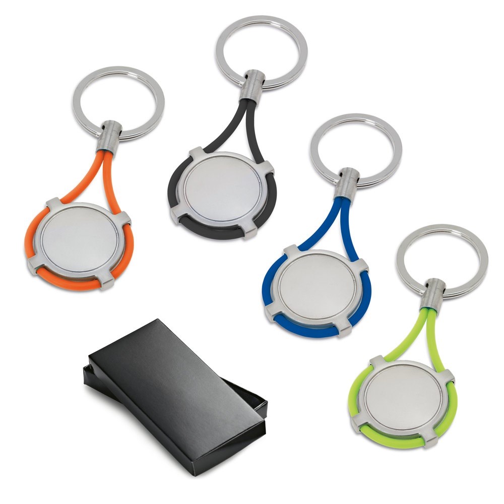 Schlüsselanhänger aus Metall und Silikon, kreisförmig. Geliefert in einer Geschenkschachtel. 36 x 66 x 5 mm