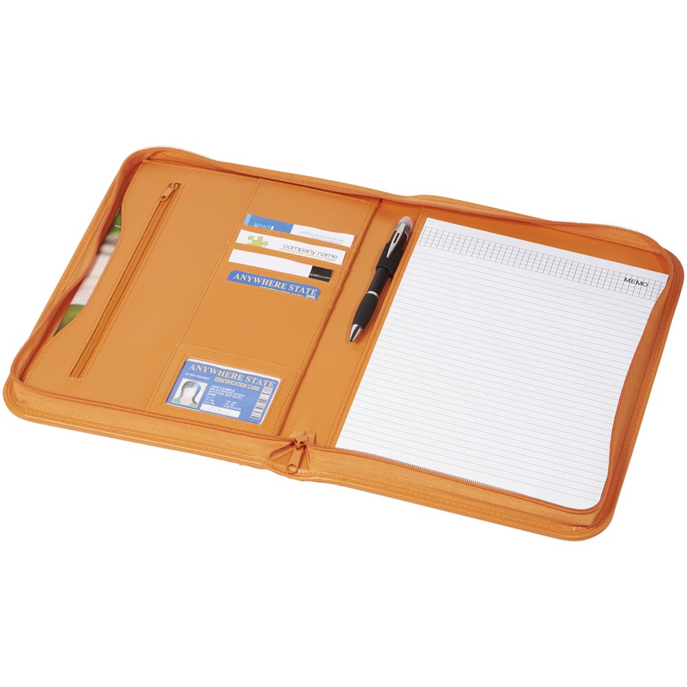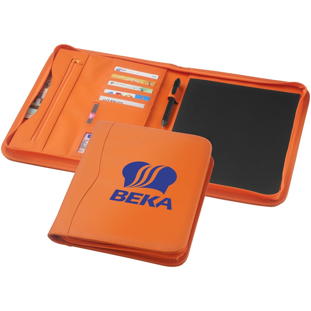 Mappe mit Reißverschluss, Stiftschlaufe, Reißverschlusstasche, Dokumentenfächern und Notizblock mit 20 Blatt.