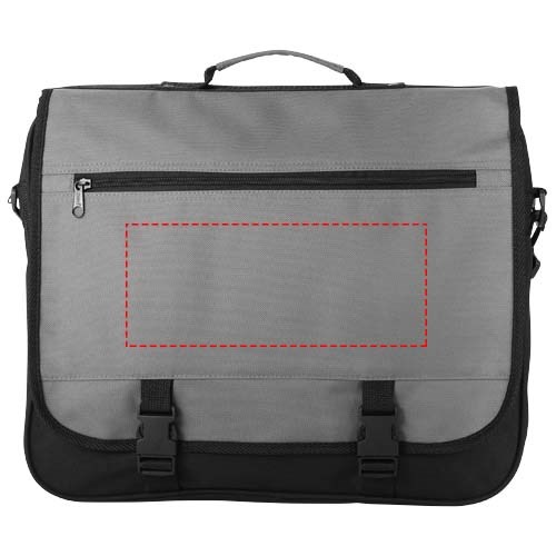 Messetasche mit einstellbarem Schulterriemen, Klappe mit Schnallenverschluss, Reißverschlussfach in der Klappe, Hauptfach mit Reißverschluss und mehreren offenen Fächern unter der Klappe.