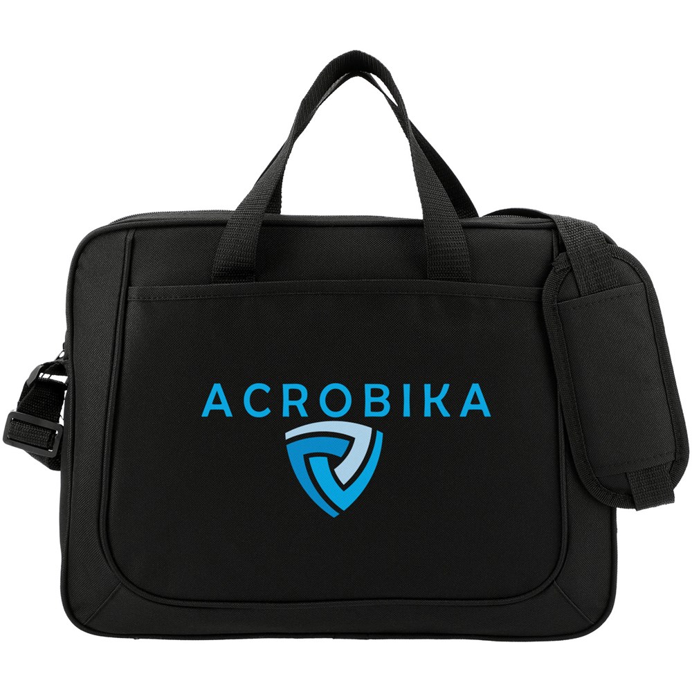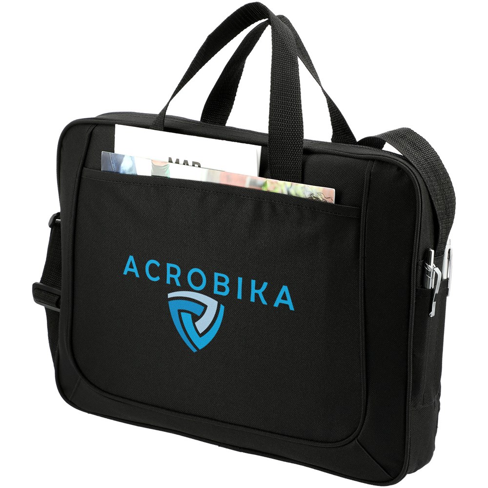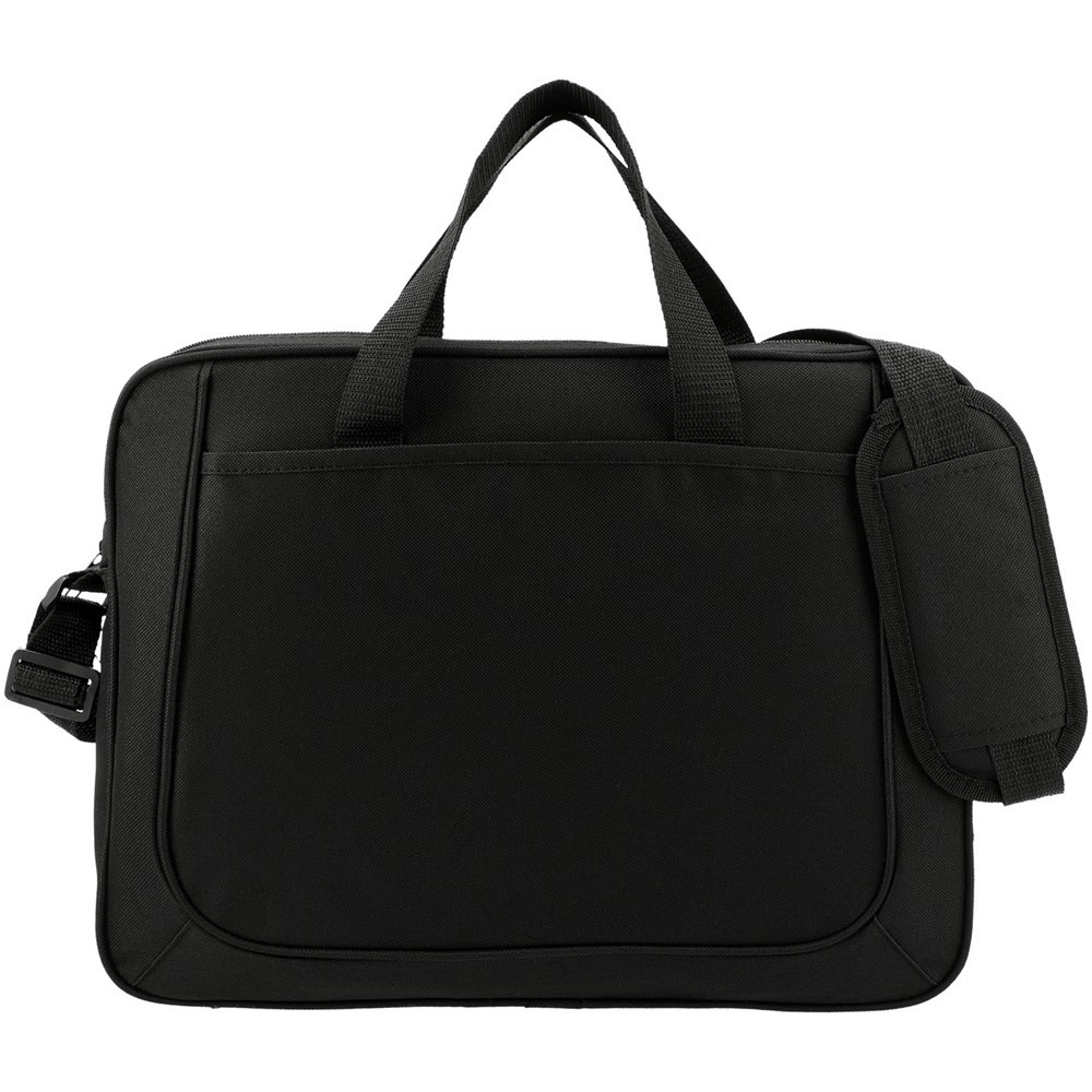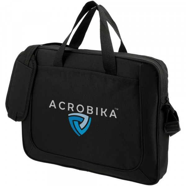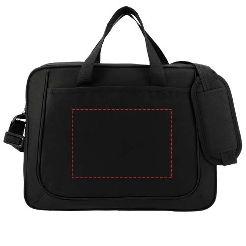 Hauptfach mit Reißverschluss mit zwei verstärkten Tragegriffen oben. Offenes Fach vorne. Seitliche Zubehörfächer und Stifthüllen. Verstellbarer, gepolsterter Schulterriemen.