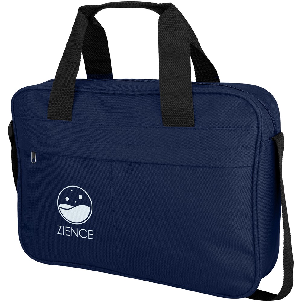Konferenztasche mit einem großen Hauptfach mit Reißverschluss und großem Frontfach mit verstecktem Reißverschluss. Verstärkter doppelter Tragegriff mit Polster. Verstellbarer Schulterriemen.