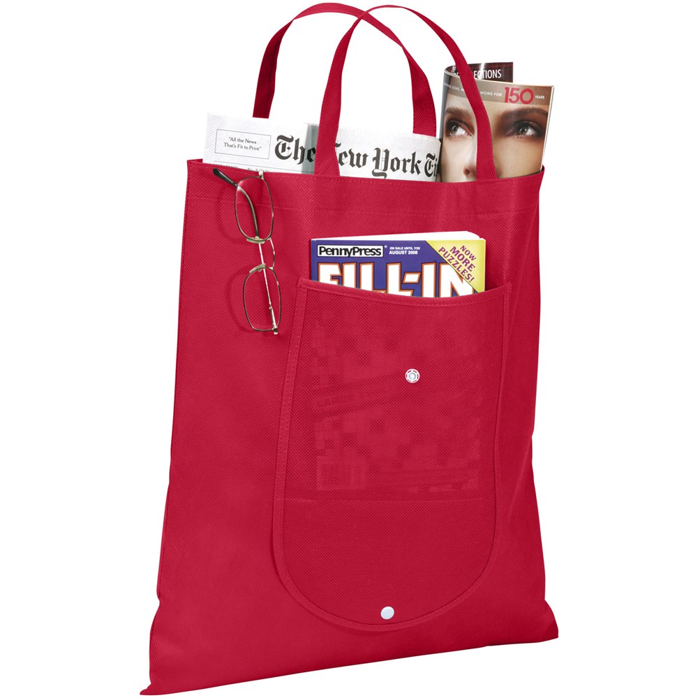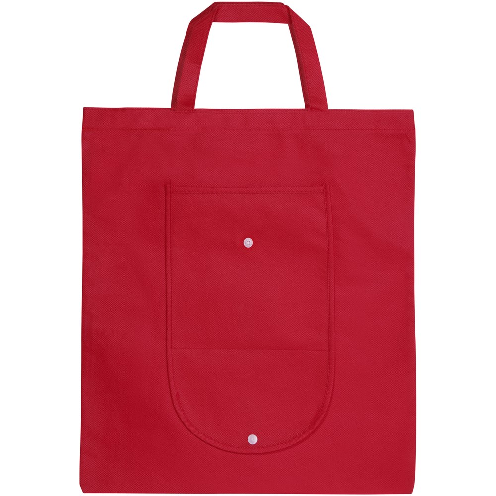 Faltbare Tragetasche mit einem offenen Hauptfach und offenem Einsteckfach auf der Vorderseite. Kunststoff Druckknopfverschluss. Wiederverwendbar und eine gute Alternative zu Plastiktüten. Tragegriffhöhe 14 cm. Größe gefaltet: 20 x 11cm. Artikel wird nicht gefaltet, flach geliefert.