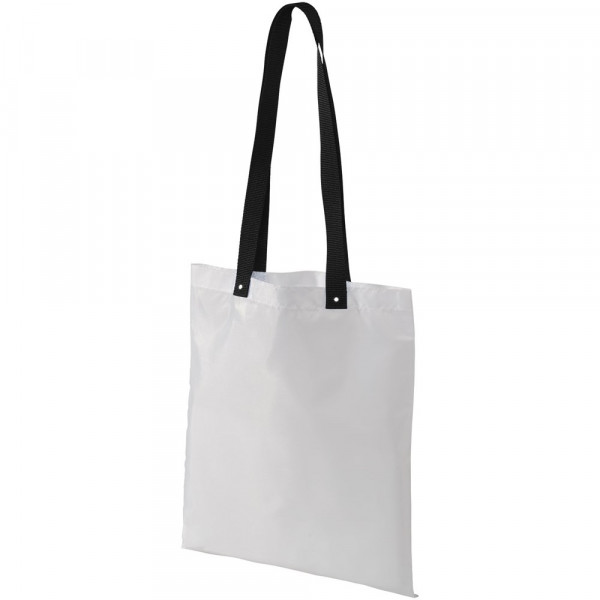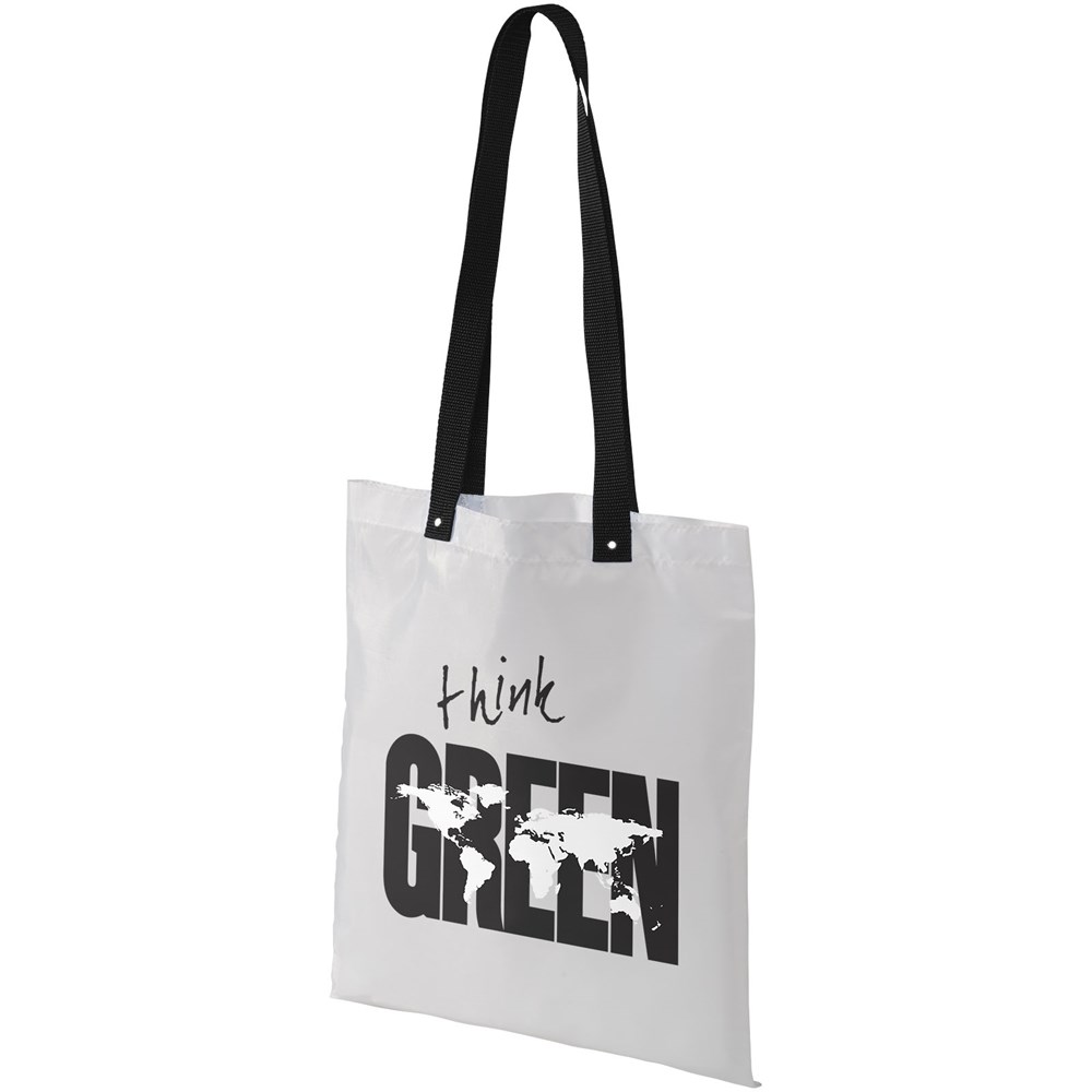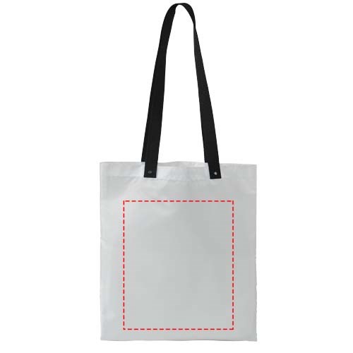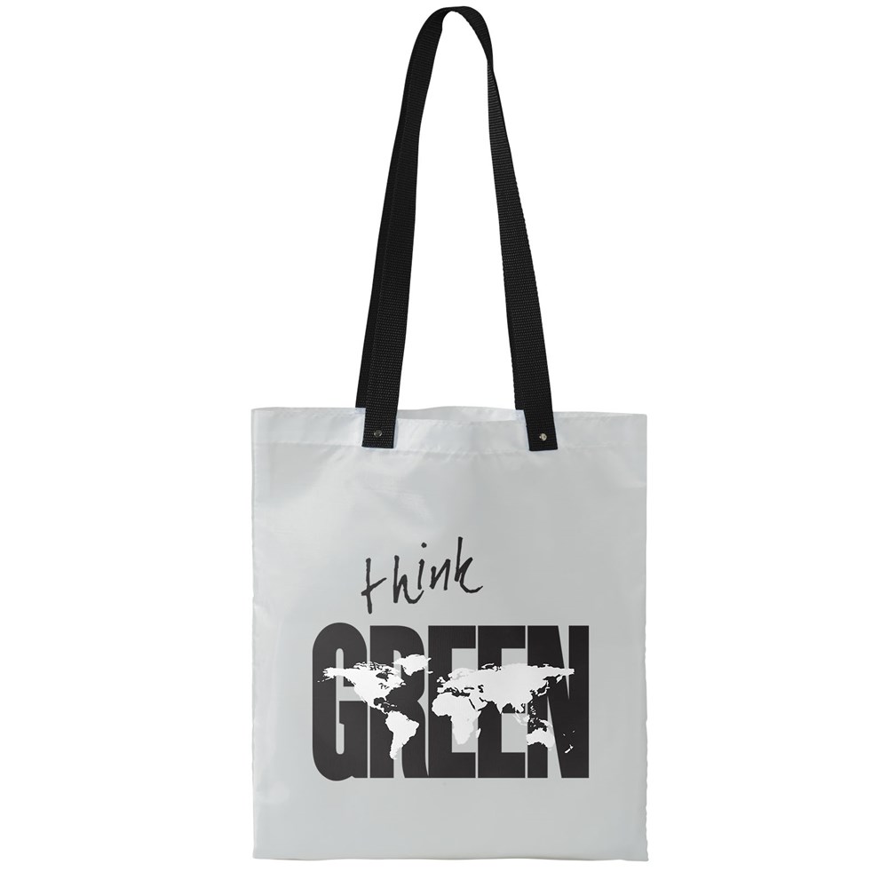 Tragetasche geeignet zum Einkaufen oder als Messetasche. Mit bunten, langen gewebten Tragegriffen, Tragegriffhöhe 32,5 cm. Tragegriffe am Ende durch Metallknöpfe verstärkt.