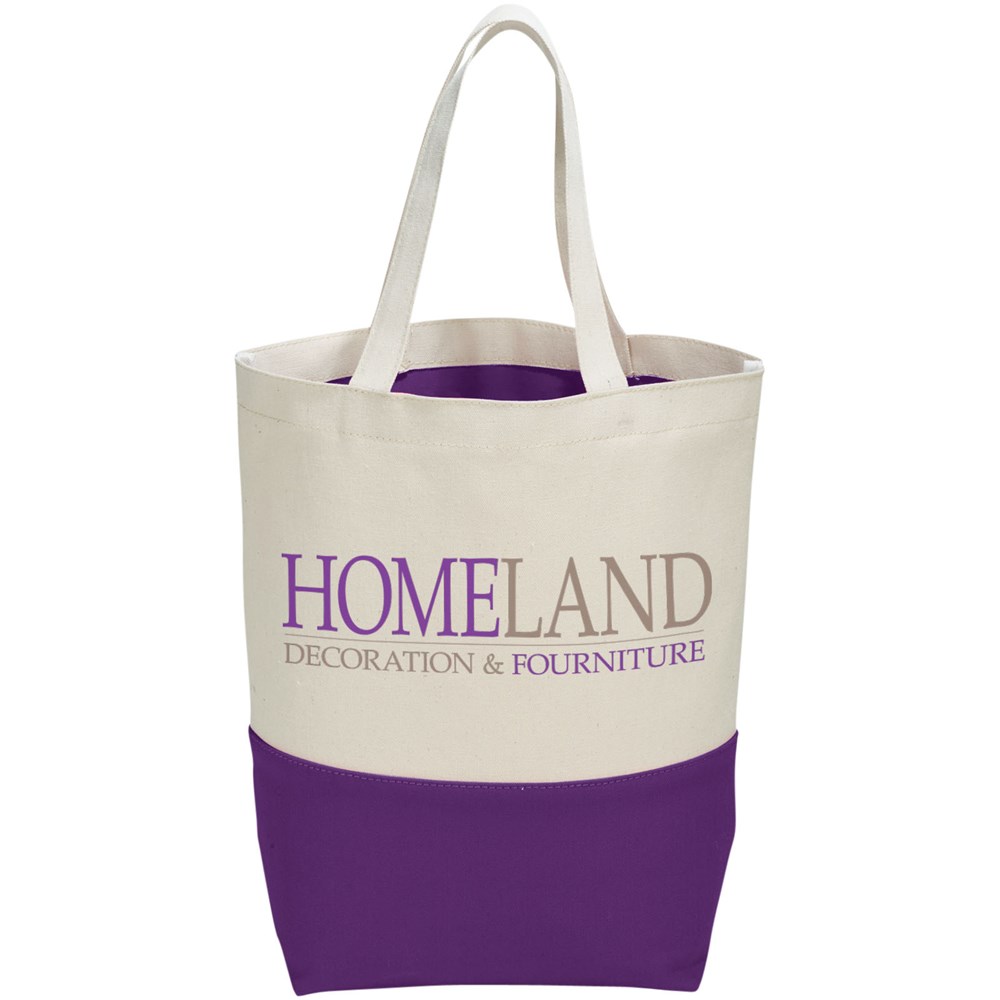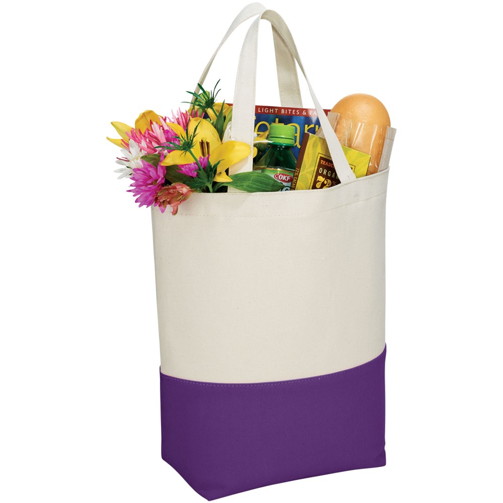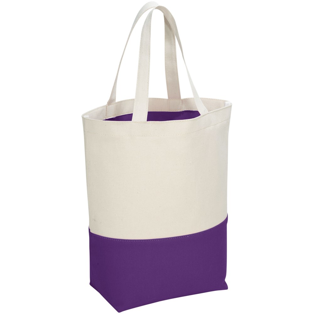 Diese 280 g/m² Baumwolltasche bietet attraktive farbliche Akzente entlang des Bodens. Das PVC Futter des offenen Hauptfaches ist ebenfalls farblich abgesetzt, sodass die Tasche leicht zu reinigen ist und perfekt geeignet für nasse Schwimmkleidung. Inkl. Bodenplatte für mehr Haltbarkeit, 18 cm Tragegriffhöhe.