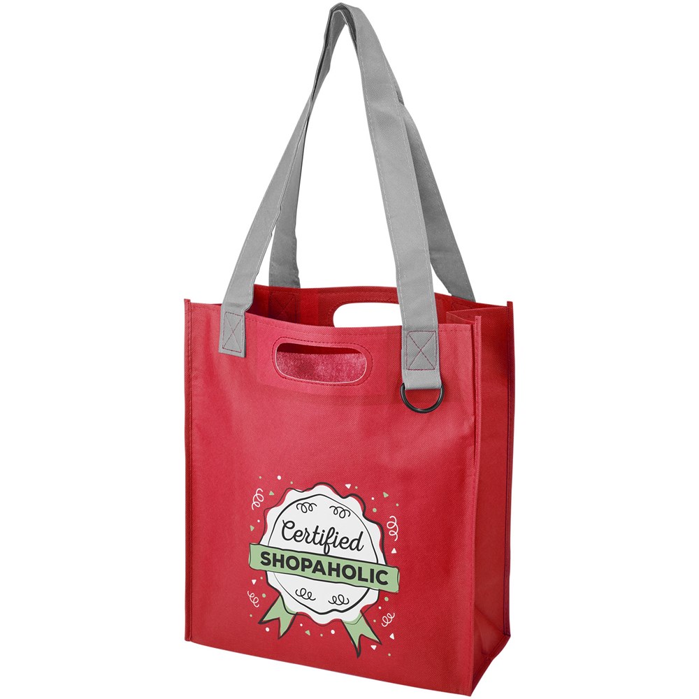 Diese haltbare PP-NonWoventasche ist perfekt für die Verwendung bei Messen, Konferenzen und Veranstaltungen geeignet. Die perfekte Größe für das Aufbewahren von Dokumenten, eine Kunststoffschlaufe für das Anbringen von Veranstaltungspässen, starke Tragegriffe und ein Seitenfach für Stifte.