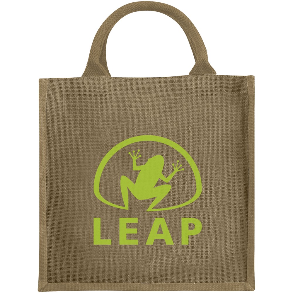 Jute Tasche mit laminiertem offenem Hauptfach und Faltentasche. Rollhenkel aus Baumwolle. mehr