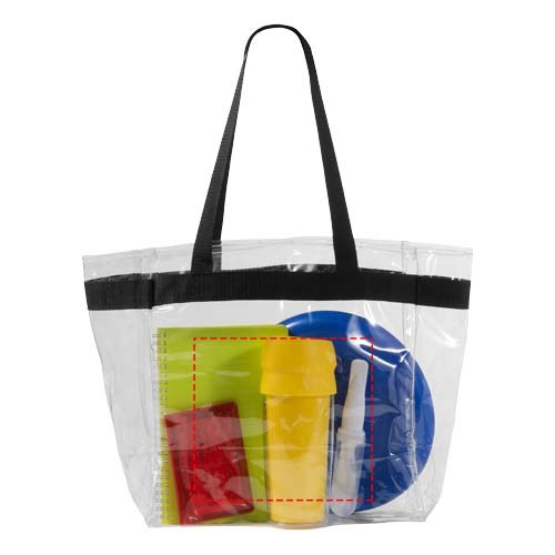 Diese durchsichtige Tasche ist perfekt für Fans auf dem Weg ins Stadion und die sichere Unterbringung von Dingen für Veranstaltungstage. Auch großartig für die Sicherheit bei der Arbeit und in der Schule geeignet. Offenes Hauptfach mit sportlicher Bandverzierung und zwei Henkeln. 27 cm lange Tragegriffe.