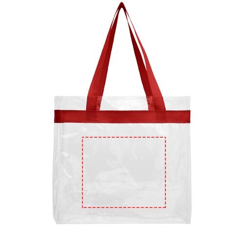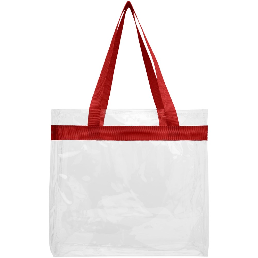 Diese durchsichtige Tasche ist perfekt für Fans auf dem Weg ins Stadion und die sichere Unterbringung von Dingen für Veranstaltungstage. Auch großartig für die Sicherheit bei der Arbeit und in der Schule geeignet. Offenes Hauptfach mit sportlicher Bandverzierung und zwei Henkeln. 27 cm lange Tragegriffe.