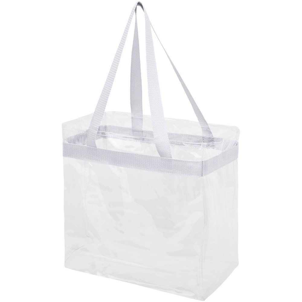 Diese durchsichtige Tasche ist perfekt für Fans auf dem Weg ins Stadion und die sichere Unterbringung von Dingen für Veranstaltungstage. Auch großartig für die Sicherheit bei der Arbeit und in der Schule geeignet. Offenes Hauptfach mit sportlicher Bandverzierung und zwei Henkeln. 27 cm lange Tragegriffe.