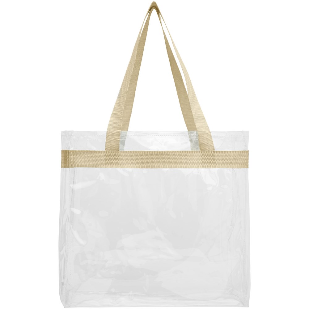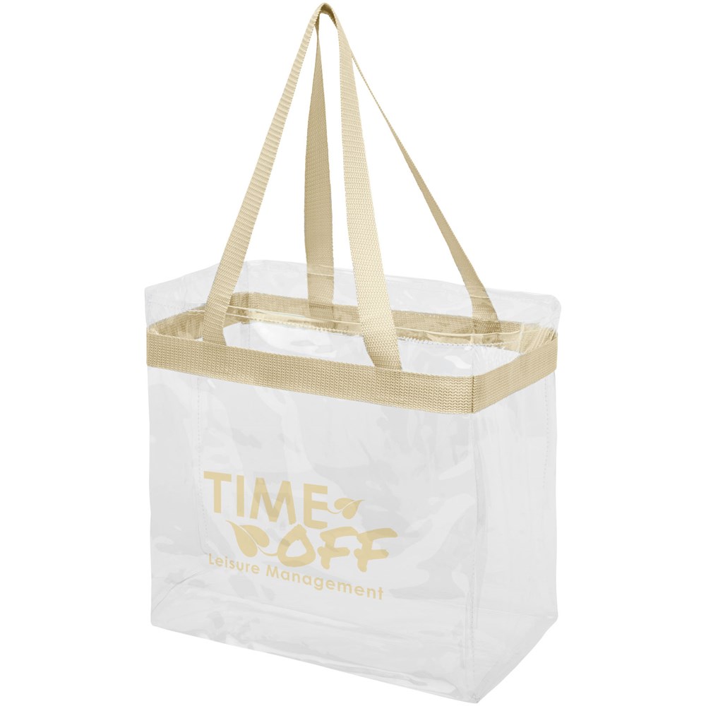 Diese durchsichtige Tasche ist perfekt für Fans auf dem Weg ins Stadion und die sichere Unterbringung von Dingen für Veranstaltungstage. Auch großartig für die Sicherheit bei der Arbeit und in der Schule geeignet. Offenes Hauptfach mit sportlicher Bandverzierung und zwei Henkeln. 27 cm lange Tragegriffe.