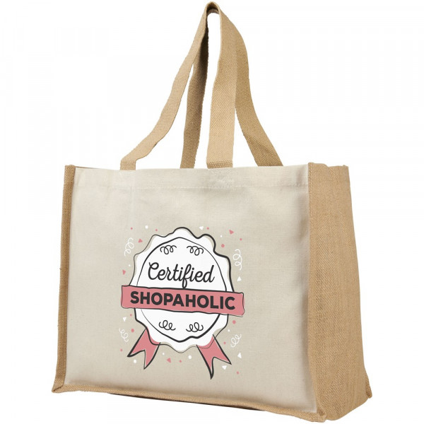 Trendige Einkaufstasche mit druckfreundlichen Seitenwänden aus 320 g/m² schwerem Canvas und charakteristischem strapazierfähigem Jute-Rahmendesign und Baumwollgriffen.