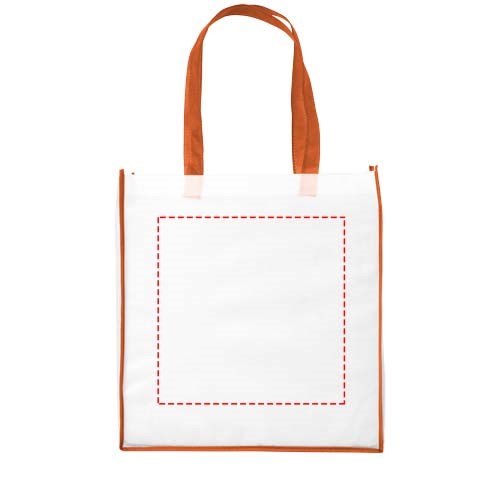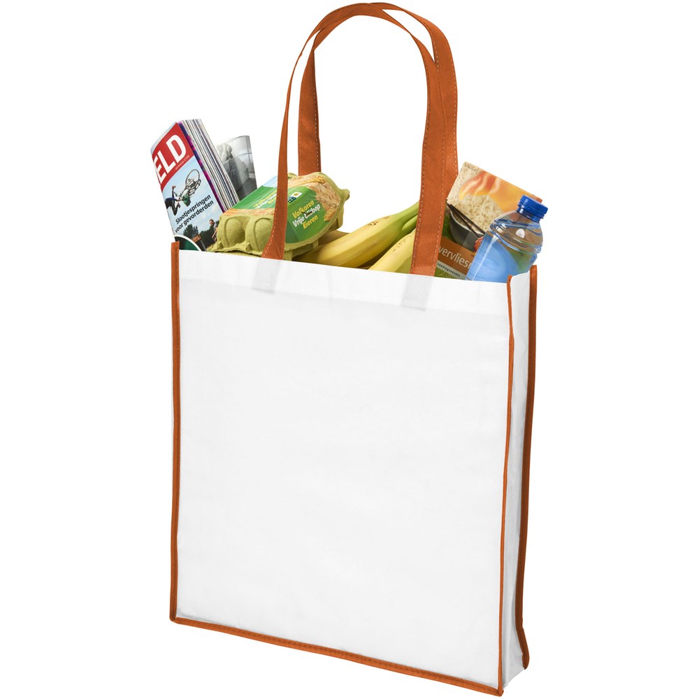 Eine Einkaufstasche aus PP-NonWovenmaterial mit farbigen Griffen und Kanten. Frisches und farbenfrohes Design. Große und praktische Version der Contrast Mini Einkaufstasche.