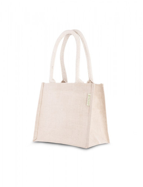 Juco Tasche Junior. Juco = 75% Jute und 25% Baumwolle. Mit luxuriösen wattierten Baumwollgriffen. Eine auffallende Geschenkverpackung für Werbegeschenke oder Kostmetikartikel.