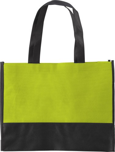 Einkaufstasche aus Non-Woven, zweifarbig, mit 9 cm Boden- und Seitenfalte mit kurzen Henkeln.