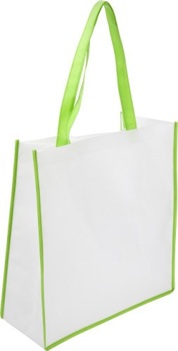 Einkaufstasche aus Non-Woven, inklusive 13 cm Boden- und Seitenfalte, farbige Applikationen.