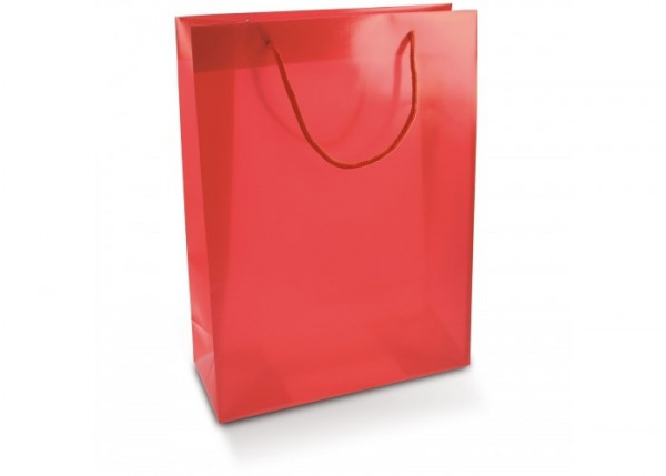 Kunststoff-Tragetasche aus PP. Transluzente Farben. Große Tasche. Maximal einfarbiger Druck pro Seite. Mehrfarbiger Druck und Sondermaße dieser Tasche sind ab einer Bestellmenge von 10.000 Stück möglich (Lieferzeit ca. zwölf Wochen).