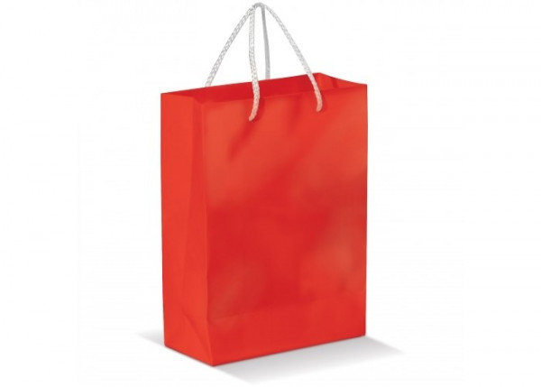 Große Papiertüte mit Seilgriffen. Erhältlich in mehreren Farben mit weißen/schwarzen Griffen. Große Druckfläche auf beiden Seiten. Starke Tasche. Glänzende Laminierung.