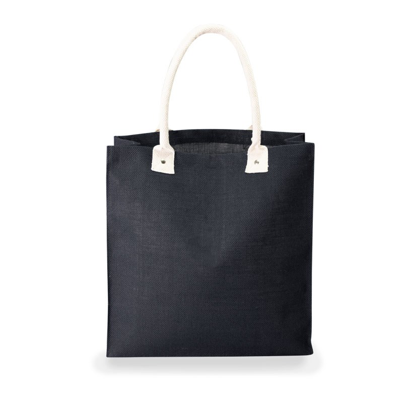 Farbige Jutefaser-Tasche mit hellen Henkeln und Nieten, 30 x 40 x 18 cm, Siebdruck bzw. Transferdruck, ca. 25 x 30 cm (Druck)