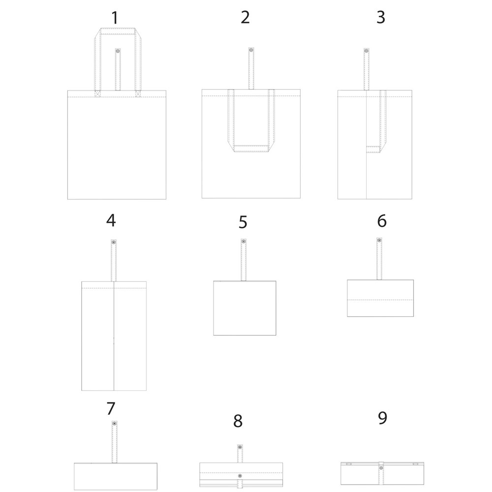 Tragetasche mit offenem Hauptfach und farbigen Griffen mit einer Tragegriffhöhe von 32 cm. Verfügt über einen Riemen mit Knopfverschluss, um die Tasche gefaltet zu halten. Beständigkeit bis zu 8 kg.