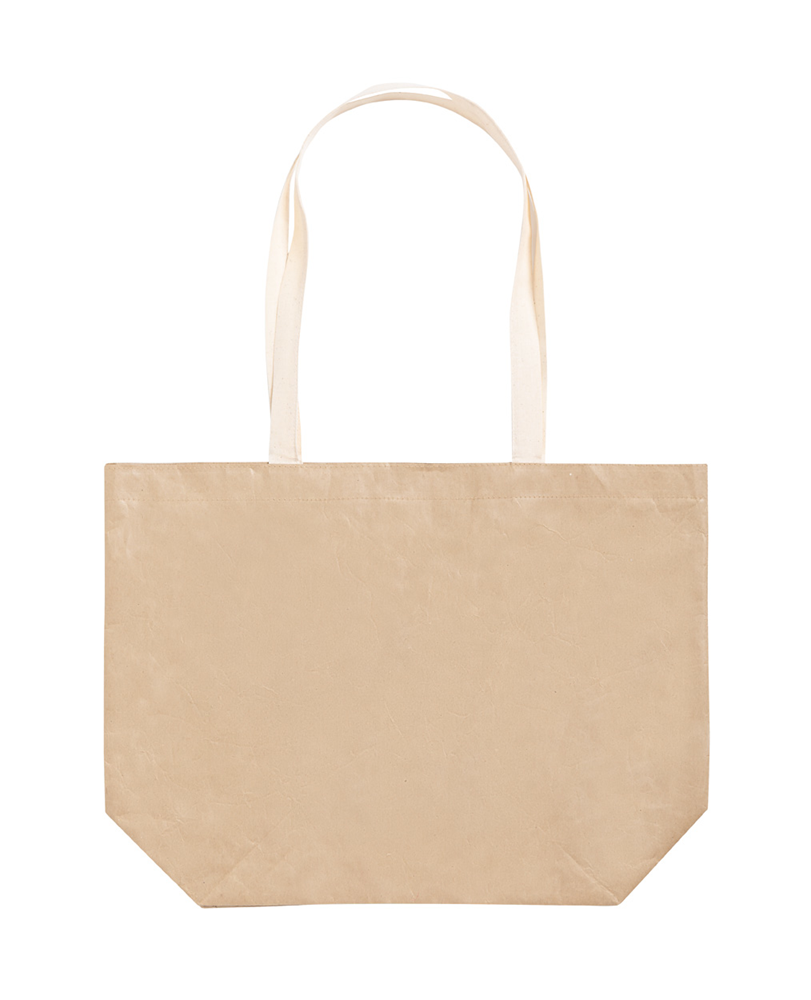 Einkaufstasche aus laminiertem Papier mit langen Baumwollgriffen.