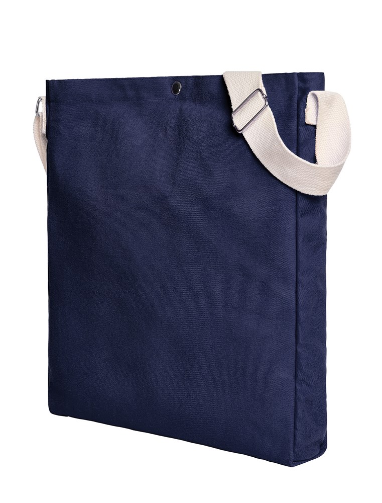 gradliniger Shopper mit großer Werbefläche; geräumiges Hauptfach - ideal geeignet für Kataloge und DIN A4-Unterlagen, mit Druckknopf verschließbar; breiter, längenverstellbarer Baumwoll-Schultergurt