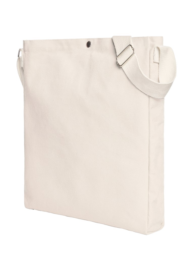 gradliniger Shopper mit großer Werbefläche; geräumiges Hauptfach - ideal geeignet für Kataloge und DIN A4-Unterlagen, mit Druckknopf verschließbar; breiter, längenverstellbarer Baumwoll-Schultergurt