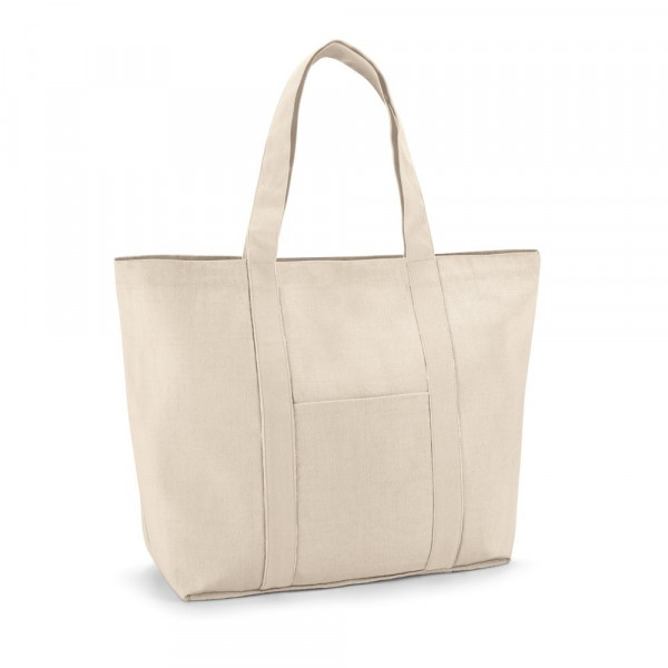 Tragetasche aus 100% Canvas Baumwolle (280 g/m²) mit Magnetverschluss, Innentasche mit Reißverschluss sowie einer Vordertasche und 60 cm langen Henkeln. 530 x 380 x 170 mm