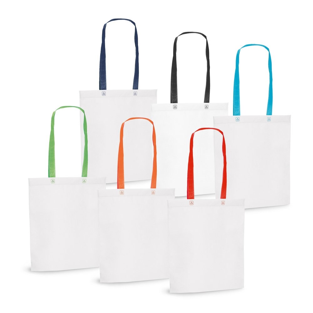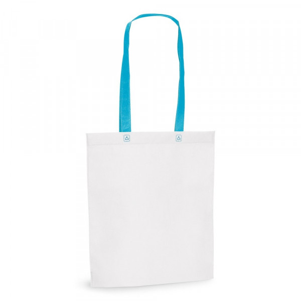 Tragetasche aus Non-Woven (80 g/m²), thermoversiegelt und mit 55 cm langen Henkeln. 330 x 390 x 80 mm