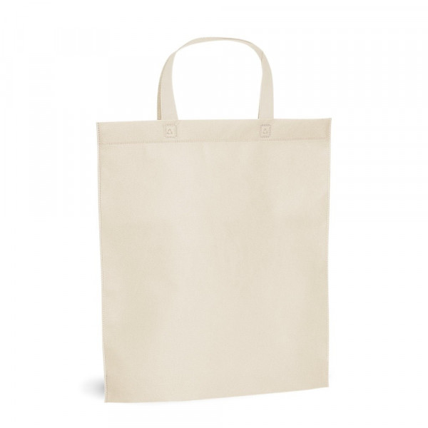 Tragetasche aus Non-Woven (80 g/m²), thermoversiegelt und mit 30 cm langen Henkeln. 380 x 415 x 85 mm