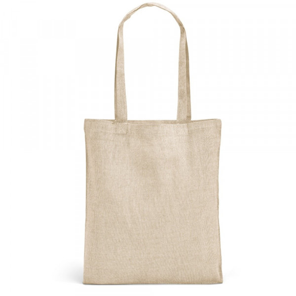 Tragetasche aus recycelter Baumwolle (140 g/m²) mit 65 cm langen Henkeln. 375 x 415 mm