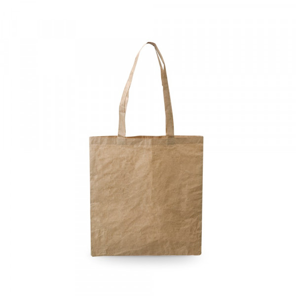 Umweltfreundlicher Beutel aus einem Materialmix aus Baumwollfasern und Papier in Naturfarbe und mit 60 cm langen Henkeln. Belastbar mit bis zu 9 kg.